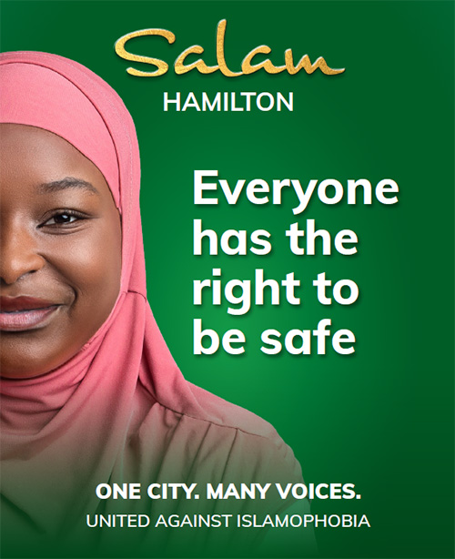 Salam Hamilton is a city-wide public education campaign co-organized by members of Muslim communities across Hamilton. Developed following direction by City Council in 2021 to pilot an inclusion campaign with a specific focus on anti-Islamophobia, Salam Hamilton balances celebration and awareness and is meant to educate, inform, and address issues of hate and intolerance. Focused on combatting racism, rooted in anti-oppression, this campaign is specifically centered on challenging Islamophobia and its very real impacts on the daily lives of Muslim residents in Hamilton.