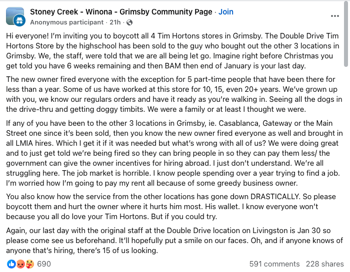 SCANDAL: Grimsby, Ontario, Tim Hortons employees at 4 different locations get pink slips for Christmas – and are being replaced by foreigners.