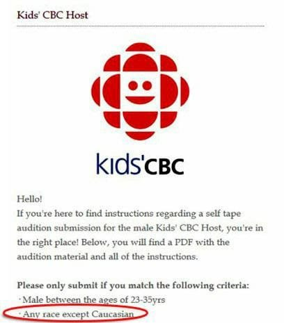 Clear cut anti-White discrimination and you pay for it at the taxpayer-funded Canadian Broadcasting Corporation (CBC). They’ll gorge themselves on White male taxpayers’ money but won’t give them a job.